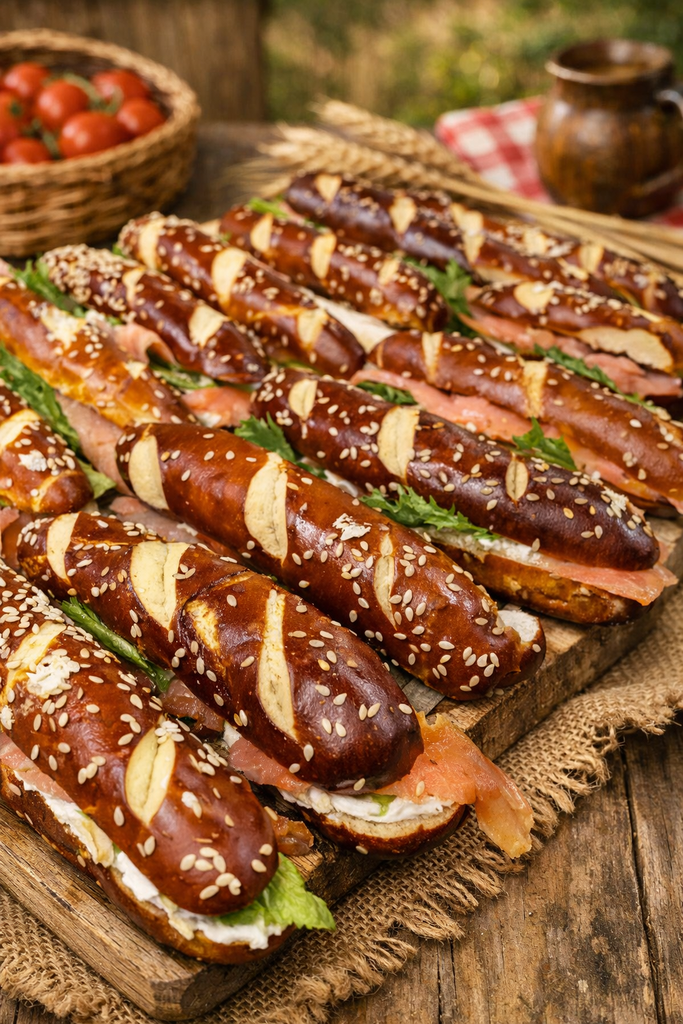 מיני פרעצל ואווריריים בציפוי שומשום, במילוי גבינת שמנת איכותית, פרוסות סלמון מעושן ועלים ירוקים טריים. שילוב קלאסי ומדויק של מליחות עדינה, רעננות וטעם עשיר, עם מרקם מושלם ונראות מוקפדת.