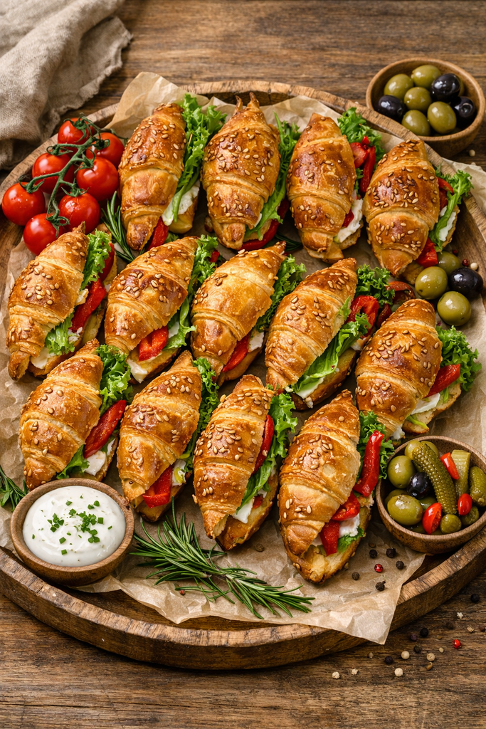 המגש כולל מיני קרואסונים במילוי גבינת עיזים ופלפל קלוי, מסודרים ומוכנים להגשה.