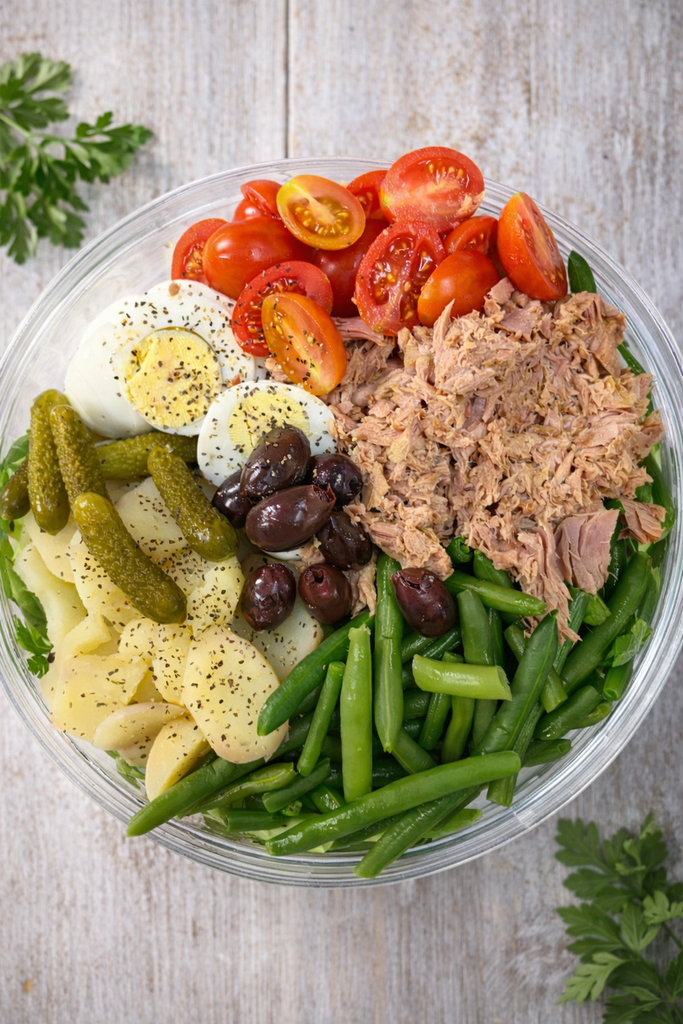 סלט ניסואז עם חסה,טונה,ביצים קשות,שעועית ירוקה, עגבניות שרי, תפוחי אדמה,זיתי קלמטה